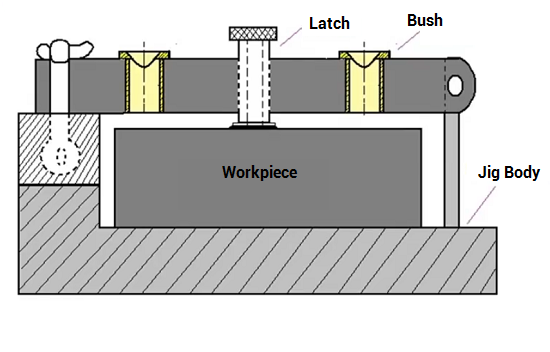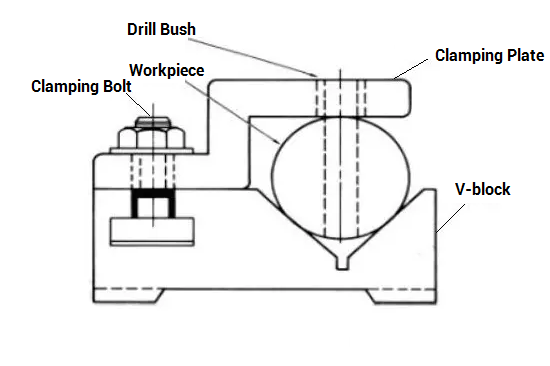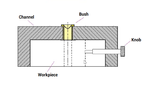 The channel jig has a channel-shaped cross-section, allowing the workpiece to be secured within the channel. The component is clamped in place using a knurled knob, and the drill is guided through bushings in the channel. This type of jig is simple yet effective, providing stability and support during machining. Channel jigs are particularly useful for holding long, thin parts and machining them along their length.