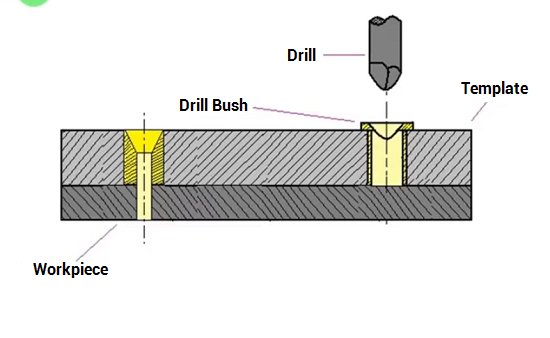 The plate jig is an improved version of the template jig, designed to provide greater accuracy and efficiency. It incorporates drill bushes into the plate, which guide the drill during operations and reduce wear caused by friction. Plate jigs are often clamped to the workpiece using nuts and bolts, ensuring stability during large-scale machining tasks. This jig is commonly used to drill multiple holes in large components while maintaining precise spacing, making it suitable for heavy-duty applications.